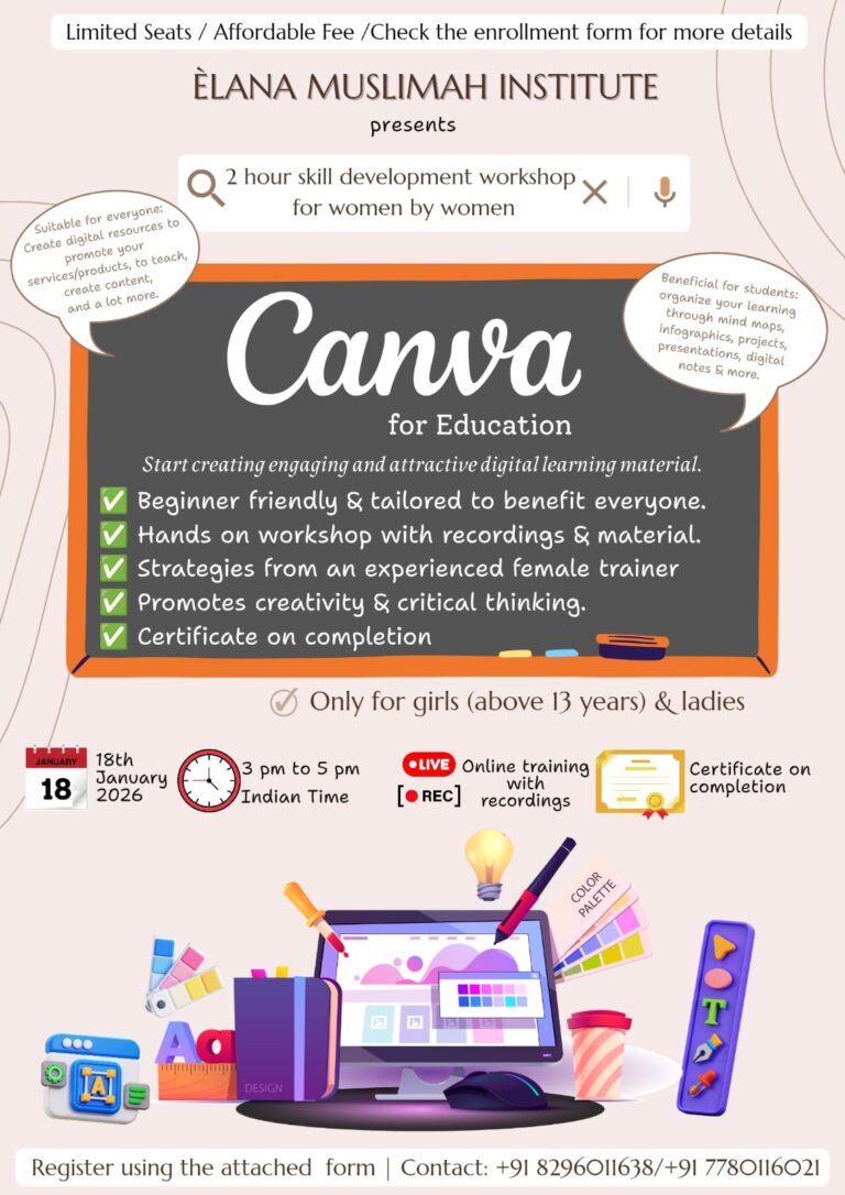 Canva for Education is a comprehensive 2-hour skill development workshop designed by women, for women, presented by Èlana Muslimah Institute. This beginner-friendly, hands-on training teaches participants to create engaging and attractive digital learning materials using Canva’s powerful education tools. Perfect for educators, students, entrepreneurs, and anyone wanting to enhance their digital content creation skills, this workshop covers creating digital resources to promote services/products, teaching materials, presentations, mind maps, infographics, projects, and much more. Participants receive live training with recordings for future reference, learn strategies from an experienced female trainer, and earn a certificate upon completion. Transform your digital creativity today!
