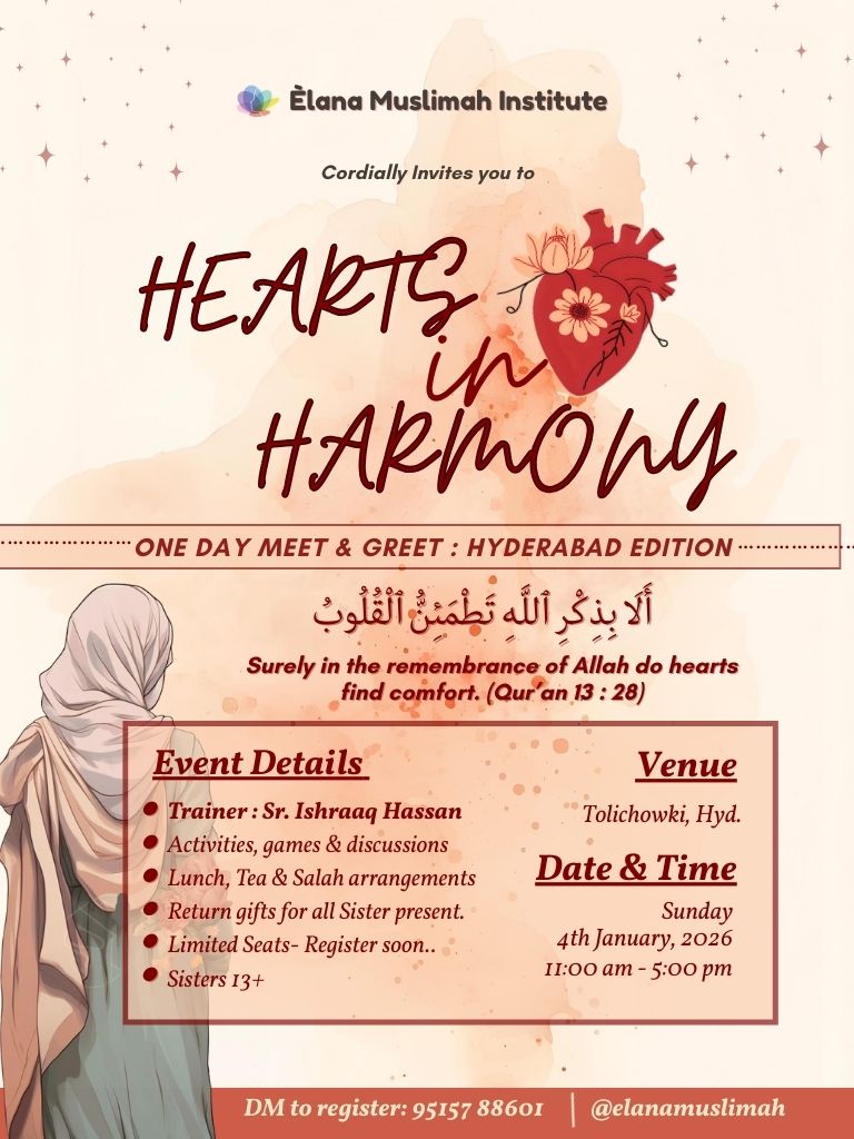 One-day Meet & Greet in Hyderabad featuring Sr. Ishraaq Hassan, activities, discussions, lunch, tea, Salah arrangements, and return gifts. Limited seats for sisters 13+—register soon for this heartwarming gathering!