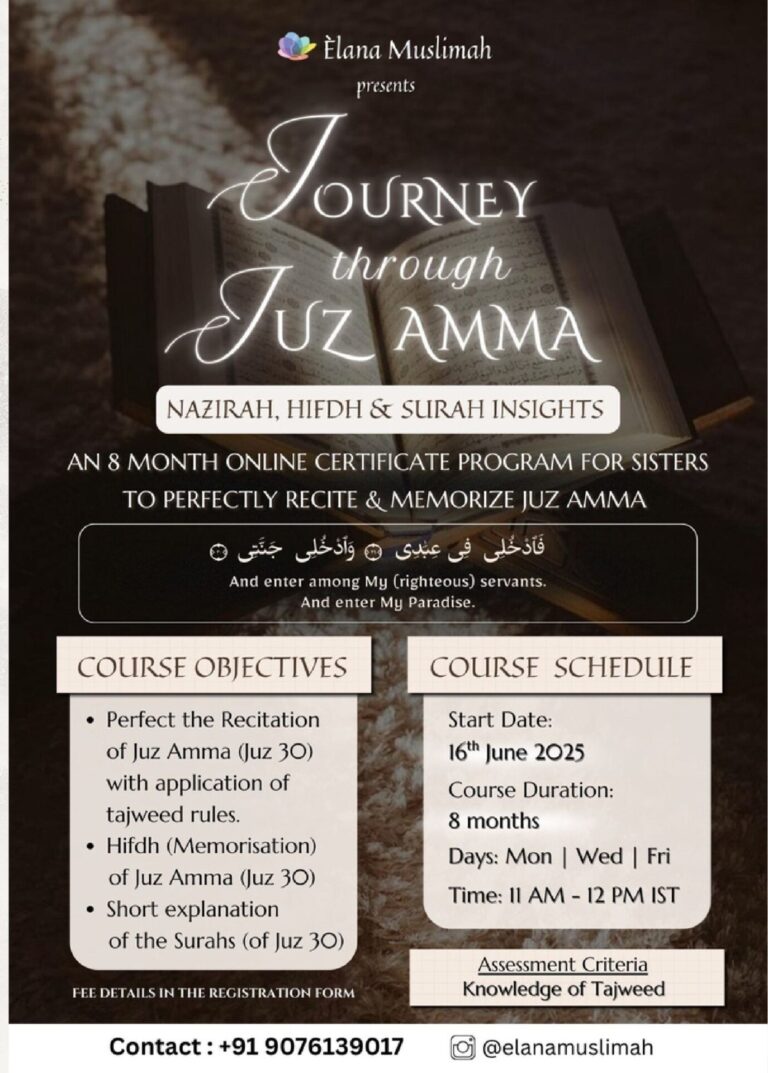 Journey through Juz Amma is an intensive 8-month online certificate program for sisters to perfectly recite and memorize Juz Amma (Juz 30) with deep understanding. This transformative course combines three essential elements: perfecting recitation with proper Tajweed application, Hifdh (memorization) of the entire Juz Amma, and short explanations of the Surahs to deepen comprehension. Guided by the verse “And enter among My [righteous] servants, And enter My Paradise” (Quran), this program offers sisters worldwide the opportunity to connect with Allah’s words through authentic knowledge, proper recitation, and heartfelt memorization. Assessment requires knowledge of Tajweed and memorization of the last 10 Surahs.