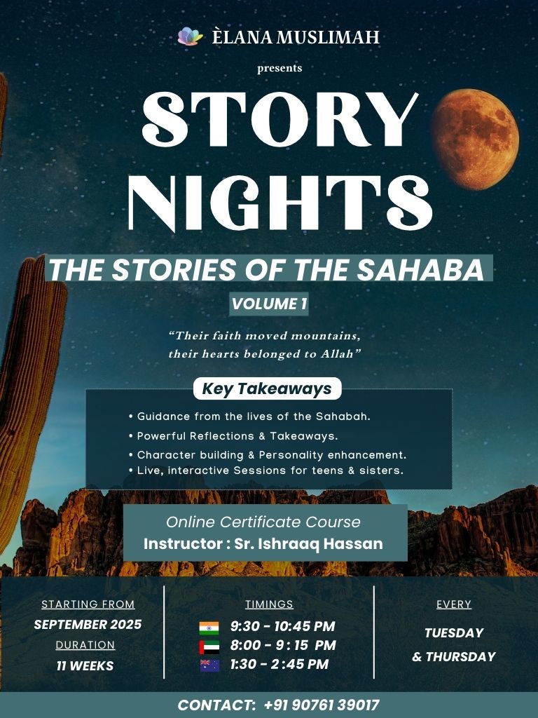 Story Nights: The Stories of the Sahaba Volume 1 is an inspiring 11-week online certificate course that brings the extraordinary lives of the Prophet’s companions to life through engaging, interactive storytelling sessions. Led by expert instructor Sr. Ishraaq Hassan, this program is specifically designed for teens and sisters seeking spiritual growth and character development. Participants will discover how the Sahaba’s unwavering faith moved mountains and learn practical life lessons from their devotion to Allah. The course offers powerful reflections, personality enhancement opportunities, and guidance drawn directly from these remarkable Islamic role models. Sessions run every Tuesday and Thursday with multiple timezone options, starting September 2025, providing flexible access to transformative Islamic education and spiritual inspiration.