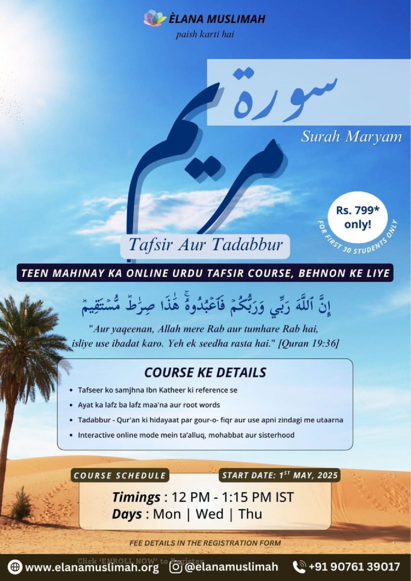 Surah Maryam: Tafsir aur Tadabbur is a specialized online Urdu Tafsir course designed exclusively for teen girls (Mahinay), helping them connect deeply with Allah’s message. This course, titled “Paish Karti Hai,” explores the beautiful Surah Maryam through comprehensive Tafsir based on Ibn Kathir’s reference, word-by-word and root word analysis (lafz ba lafz maa’na), Tadabbur focusing on Qur’anic guidance for daily life (Qur’an ki hidayaat par gour-o-fiqr aur use apni zindagi me utaarna), and interactive online sessions promoting discussion, love, and sisterhood (ta’alluq, mohabbat aur sisterhood). Perfect for young Muslimahs seeking authentic Islamic knowledge in their mother tongue.