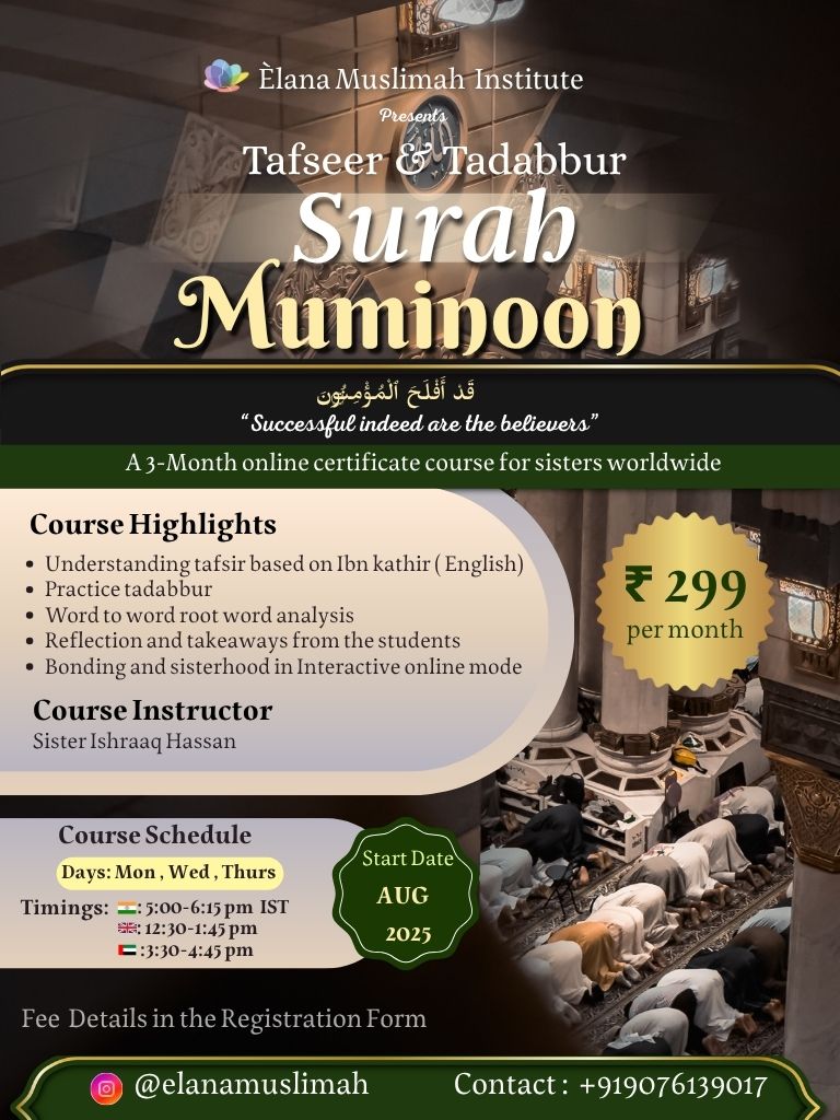 A 3-month online certificate course exploring Surah Muminoon’s profound meanings. Study Ibn Kathir’s Tafsir, practice Tadabbur, analyze root words, reflect deeply, and bond with sisters in interactive sessions worldwide.