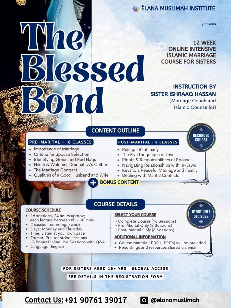 The Blessed Bond is an intensive, self-paced online Islamic marriage course designed exclusively for sisters aged 16 and above. This comprehensive program covers essential pre-marital preparation including the importance of marriage, criteria for spouse selection, identifying green and red flags, and understanding the marriage contract from both Sunnah and cultural perspectives. Post-marital modules address intimacy rulings, the five languages of love, spousal rights and responsibilities, navigating in-law relationships, and effective conflict resolution strategies. The course includes 16 in-depth sessions totaling 15+ hours, interactive worksheets, recorded Q&A sessions, and a bonus one-on-one counseling session with marriage coach Sister Ishraaq Hassan, providing lifetime access to invaluable guidance.